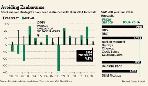 There was a telling chart in last weekend’s Wall Street Journal. It showed the market predictions of Wall Street strategists for each year going back to 2000 (see below).