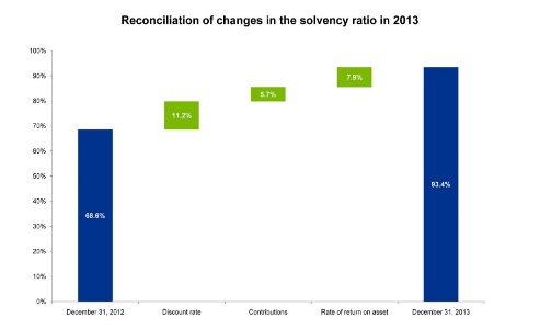 “The latest quarterly survey of more than 275 Aon Hewitt administered pension plans from the public, semi-public and private sectors found that the median solvency funded ratio, or the ratio of the market value of plan assets to liabilities, increased to 93.4% by December 31, 2013. That is a 5.7 point improvement from the end of October 2013 and 24.8 points higher than it was a year ago.”
