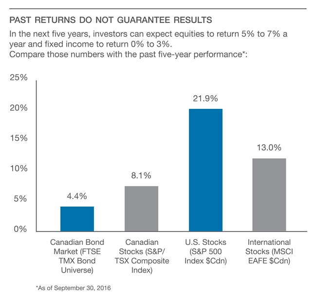 Where does that leave you? You’ll need to accept lower fixed-income returns with more volatility. Stock returns may come in below historical averages, but they will still be reasonable, especially if you use weak periods to invest more. A balanced portfolio should earn 4% to 6% over the next five years, meaning $100,000 invested today will accumulate to between $121,500 to $134,000, which is a meaningful premium over inflation and secure, cash-like instruments.