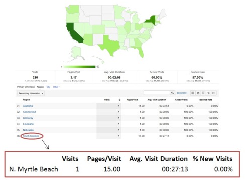 I was looking at our U.S. traffic yesterday for the month of April and noticed a particularly engaged visitor from South Carolina. They were on the site for nearly 30 minutes and visited 15 pages. Further digging showed they were a returning visitor, and were viewing our site from North Myrtle Beach. They were left-handed and had a dog named Trixy (OK, we can’t confirm this, but Google will probably be able to shortly).