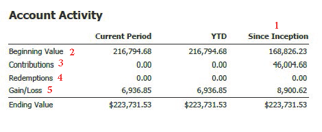 We've added a number of new features to our statements over the past months, notably the Account (or Portfolio) Activity table and Account (or Portfolio) History chart. While they are generally straightforward, I want to spend a bit of time reviewing some of the subtleties. [note: these features appear in our Q3 2013 statements]