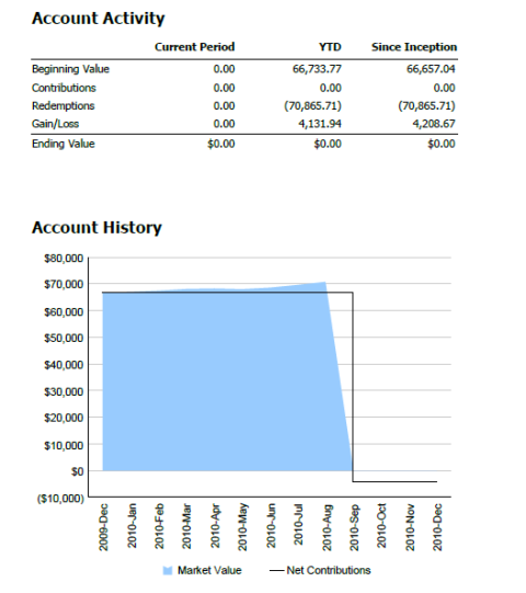 In the example below, the account was opened with an initial purchase of $66,657, which is also equal to the initial net contribution amount. When the account was closed, the ending market value was $70,865, which was redeemed in its entirety, leaving the net contribution amount equal to $66,657-$70,865 = -$4,208. The $4,208 is equal to the gain in the account.