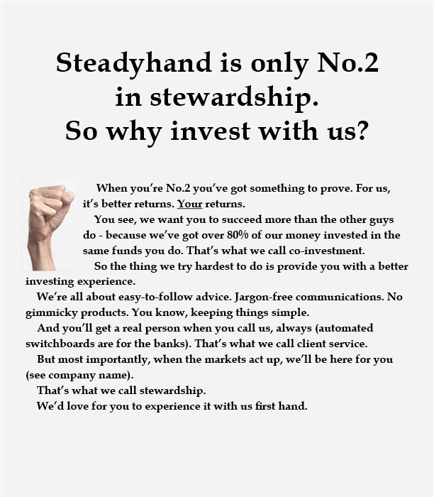 In any event, we were inspired by the old Avis ads, “When you’re only No.2, you try harder.” They’re before my day, but I love the punchy, no B.S. messaging. They got me thinking what a Steadyhand ad from the 60’s might have looked like. Maybe something like this.