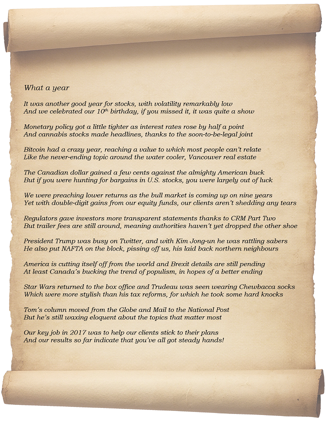 It’s also a time for reflection, lists and forecasts. On this note, we’re reintroducing an old Steadyhand tradition, the year-end poem . We hope it gives you some perspective on 2017 and brings a smile at this busy time of year. (View in PDF format here.)