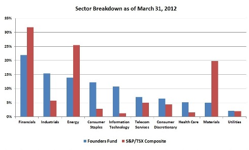 Investors with a focus on Canada (particularly index-oriented investors) are heavily tilted towards two homogeneous sectors of the economy. The Founders Fund, which currently holds more foreign stocks than Canadian, is diversified across a wider array of economic factors.