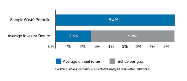 Study after study confirms what I see on the front lines—investor returns are considerably worse than the returns of the products they invest in. Indeed, Dalbar, a U.S. research firm, did a study looking at 20-year returns to December 2014. It showed that a simple mix of 60% U.S. stocks and 40% bonds generated a return of 8.4% per year, while the average investor had a return of 2.5%. Carl Richards, a financial educator and personal finance writer for the New York Times, named this shortfall the ‘Behaviour Gap’.