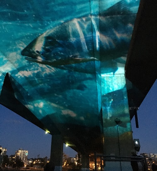 I was walking the dog on the seawall the other night and stumbled across a cool spectacle under the Cambie Bridge. It was called Uninterrupted. Essentially, the bridge was transformed into a movie theatre, with a half-hour film projected onto its underside and pillars. The film took viewers on the migratory journey of the Pacific salmon.