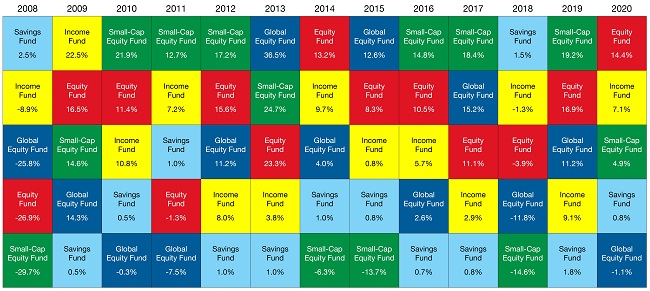 Note: the Founders Fund is not included in the table, as it was not launched until 2012. The fund's calendar year returns are as follows — 2013: 15.7%, 2014: 7.1%, 2015: 3.9%, 2016: 6.7%, 2017: 7.9%, 2018: -4.9%, 2019: 11.6%, 2020: 8.5%. The Global Small-Cap Equity Fund and Builders Fund are also not included, as they were launched in 2019.